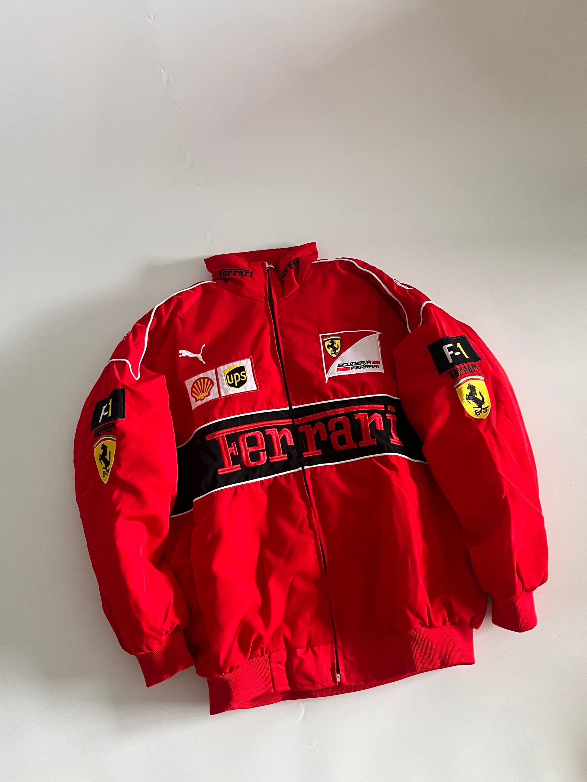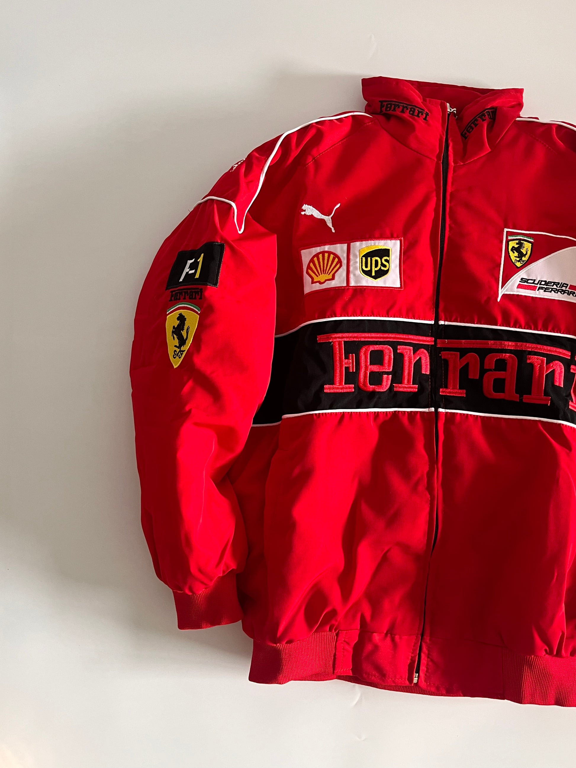 Ferrari racing jacket in iconic Ferrari red, featuring bold branding and sponsor logos, including Shell, Puma, and UPS. This jacket is perfect for Formula 1 enthusiasts and Ferrari fans, combining style and team pride in a striking design. A must-have for any motorsport collector!