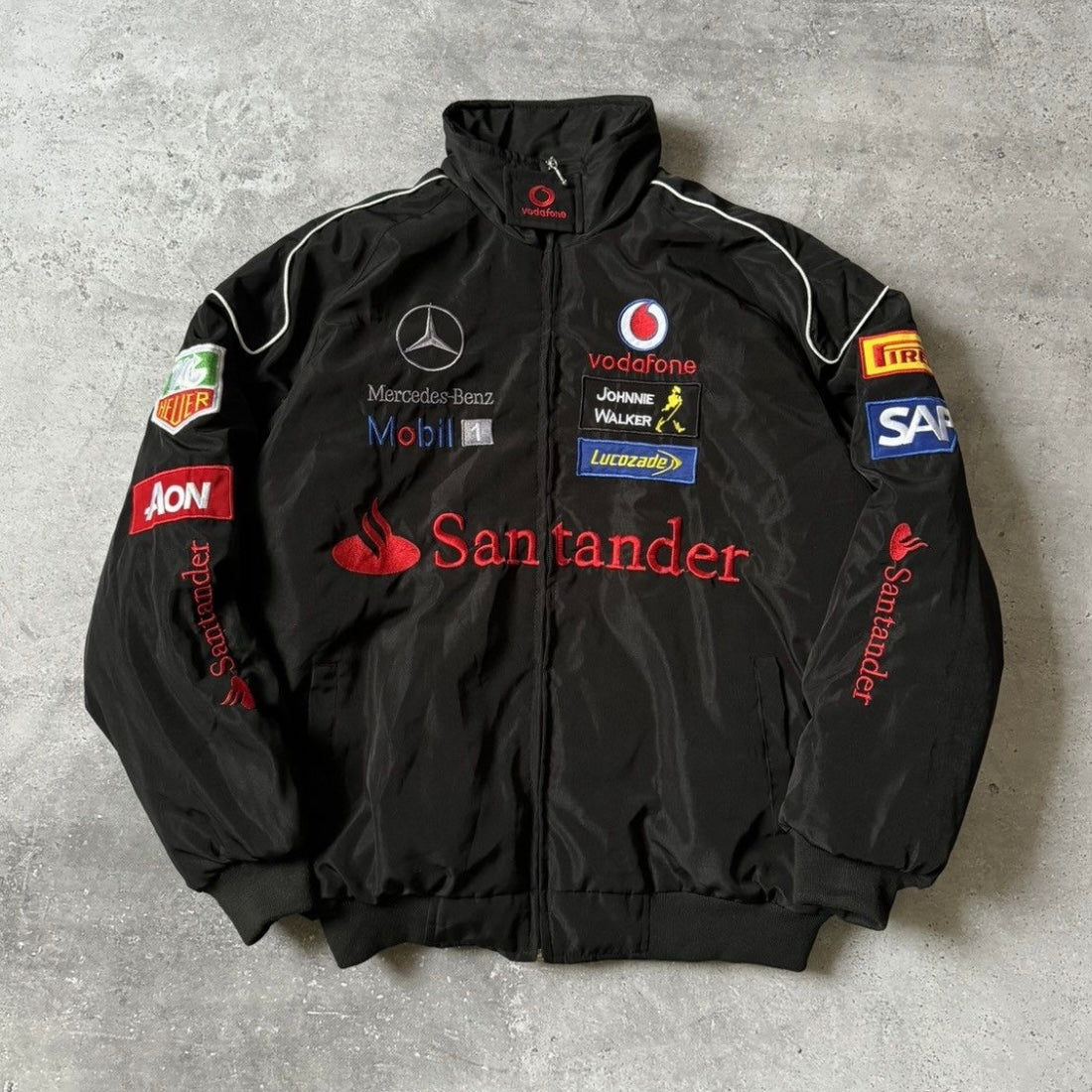 Introducing the ultimate collector's item for F1 enthusiasts - the McLaren Mercedes Racing Jacket. This exclusive jacket showcases the iconic logos of Vodafone, Santander, and Mercedes-Benz in a sleek black design. Perfect for fans and collectors alike, this jacket combines style and team pride in one must-have piece.